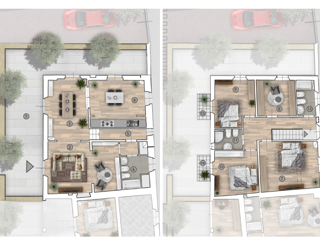 PIANO TERRENO - SEMINTERRATO : Il piano terra del progetto prevede la realizzazione di due appartamenti caratterizzati da un design moderno e funzionale. Entrambi gli appartamenti godono di affacci su più lati, permettendo una ventilazione naturale ottimale e una grande quantità di luce naturale che rende gli ambienti interni luminosi e accoglienti. Ogni appartamento è dotato di un resede privato, uno spazio esterno esclusivo ideale per momenti di relax all’aperto.