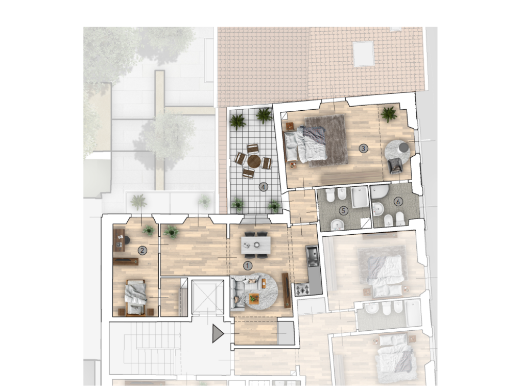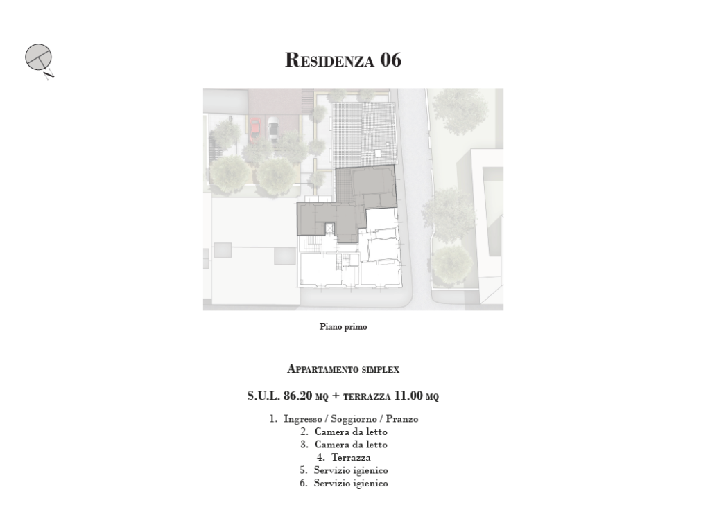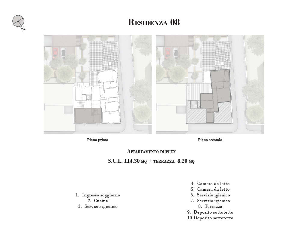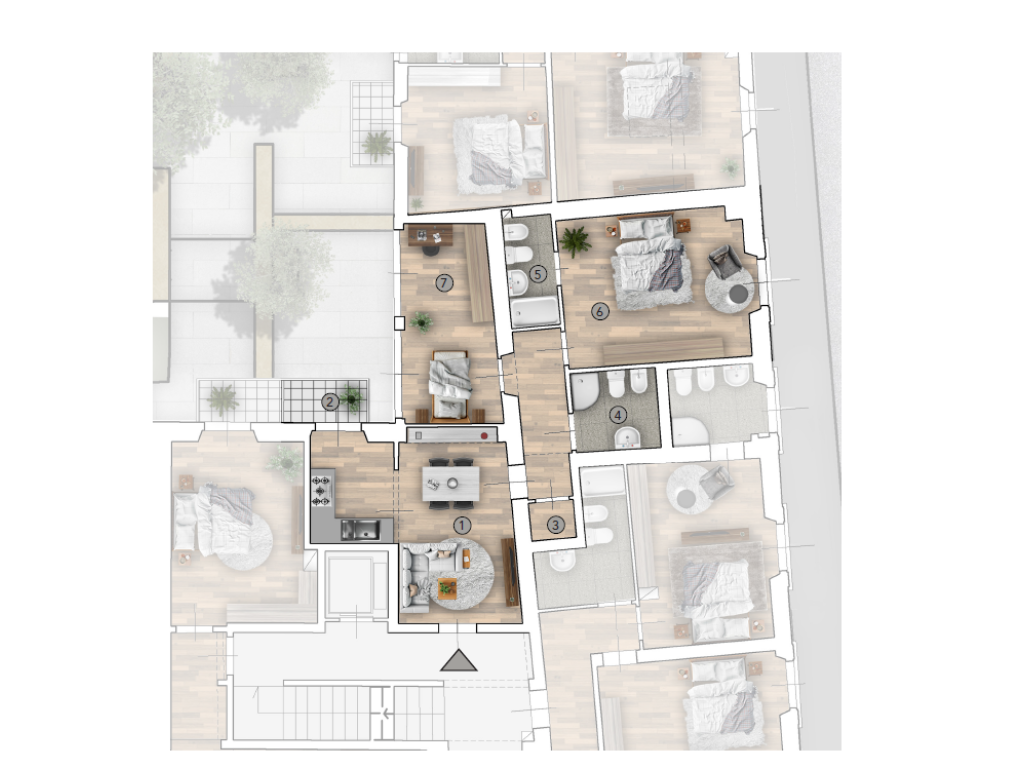 PIANO PRIMO : Al piano primo, si trovano tre affascinanti appartamenti, tra cui l’esclusivo appartamento 8 che si sviluppa in un elegante duplex fino al secondo piano. Ogni residenza è progettata per massimizzare la luminosità naturale e la ventilazione ottimale, mentre solo l’appartamento 06 si distingue per la sua splendida terrazza privata.