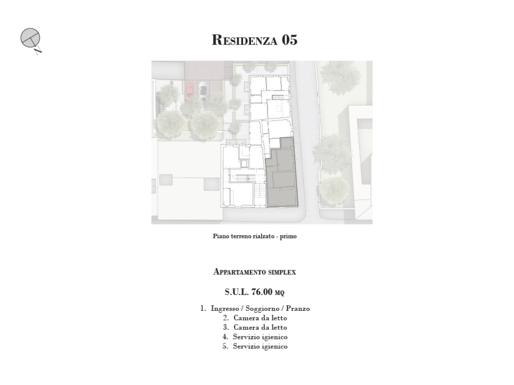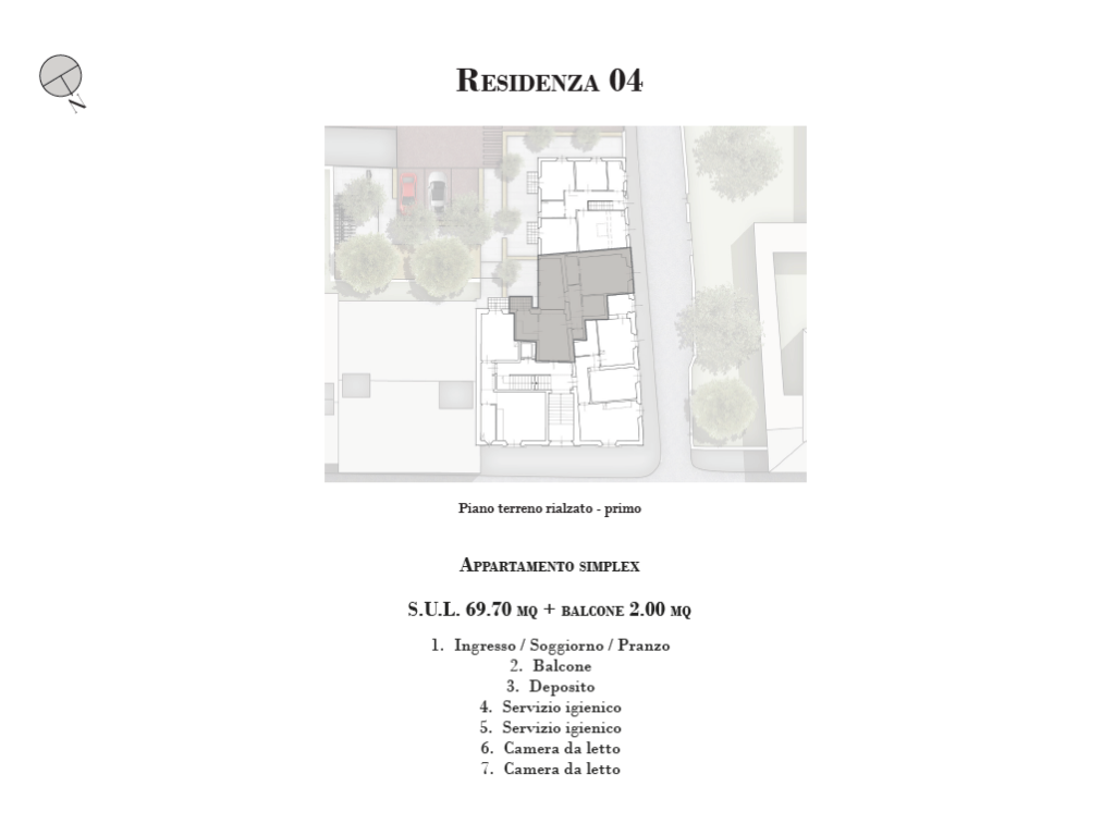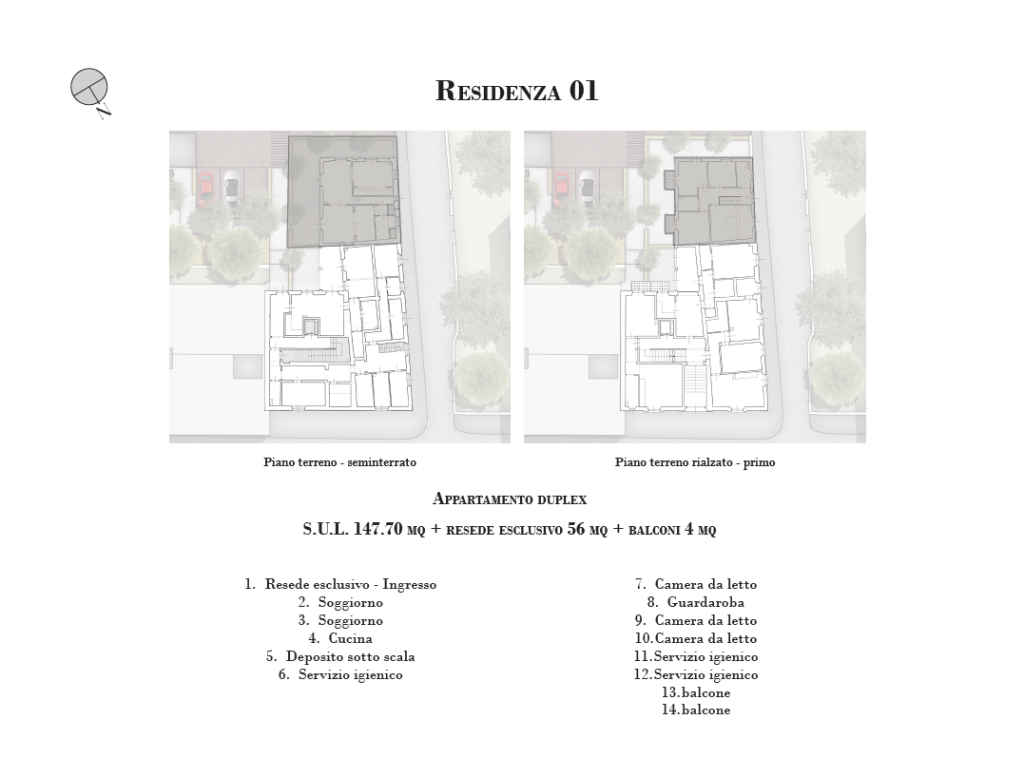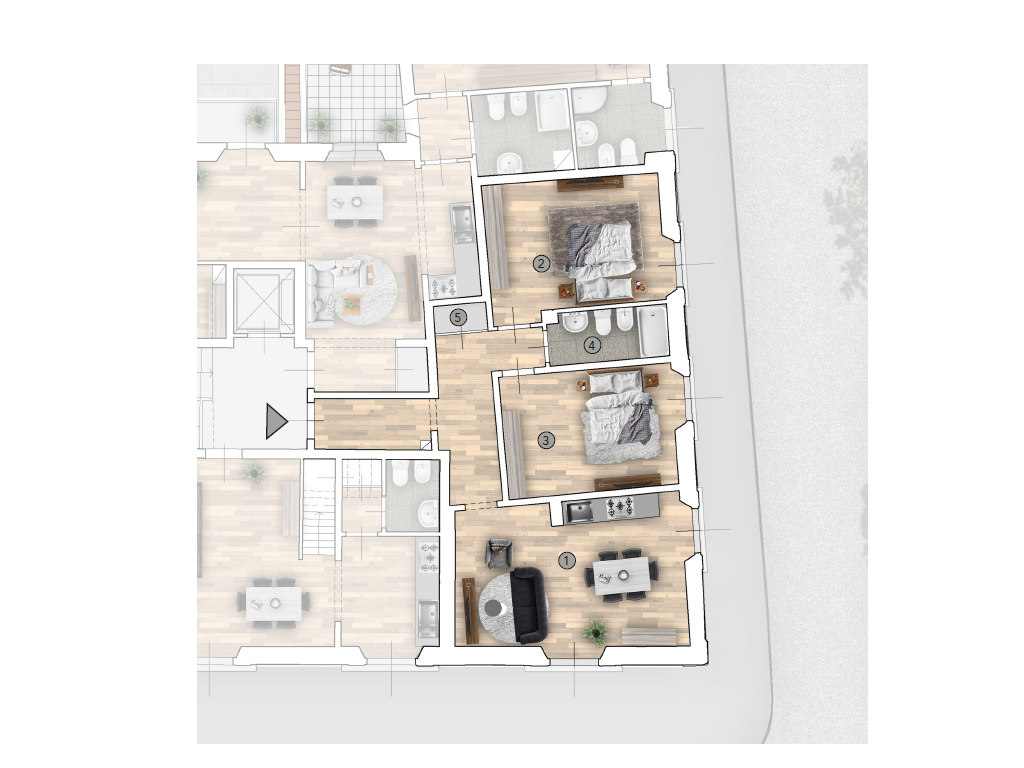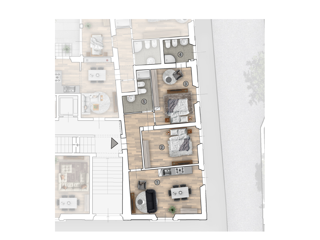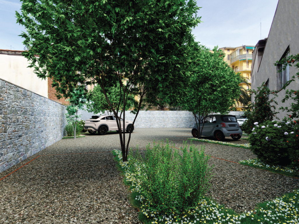 PIANO RIALZATO - PRIMO : Al piano terreno rialzato - primo, tre appartamenti sono accessibili tramite un vano scala centrale. Sul lato dell’edificio più piccolo, il duplex si estende dal primo piano alla zona notte. Ogni unità abitativa dispone di balconi che si affacciano sul giardino posteriore; inoltre, tutti gli appartamenti godono di una luminosità e ventilazione ottimali, con il duplex che include anche un lucernario per ulteriore illuminazione naturale. Questa nuova configurazione garantisce ambienti moderni, luminosi e ben ventilati per ogni unità abitativa, ideali per chi cerca un mix di comfort abitativo e connessione con gli spazi esterni, all’interno di un contesto urbano completo di servizi e comodità.