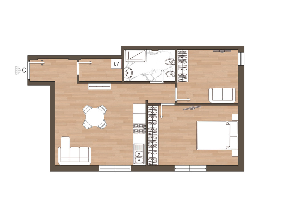 C : Trilocale composto da ingresso, soggiorno-cucina openspace, ripostiglio-lavanderia, camera matrimoniale, camera singola e servizio. 335.000+iva