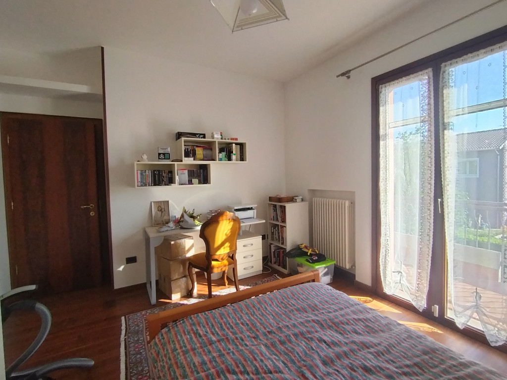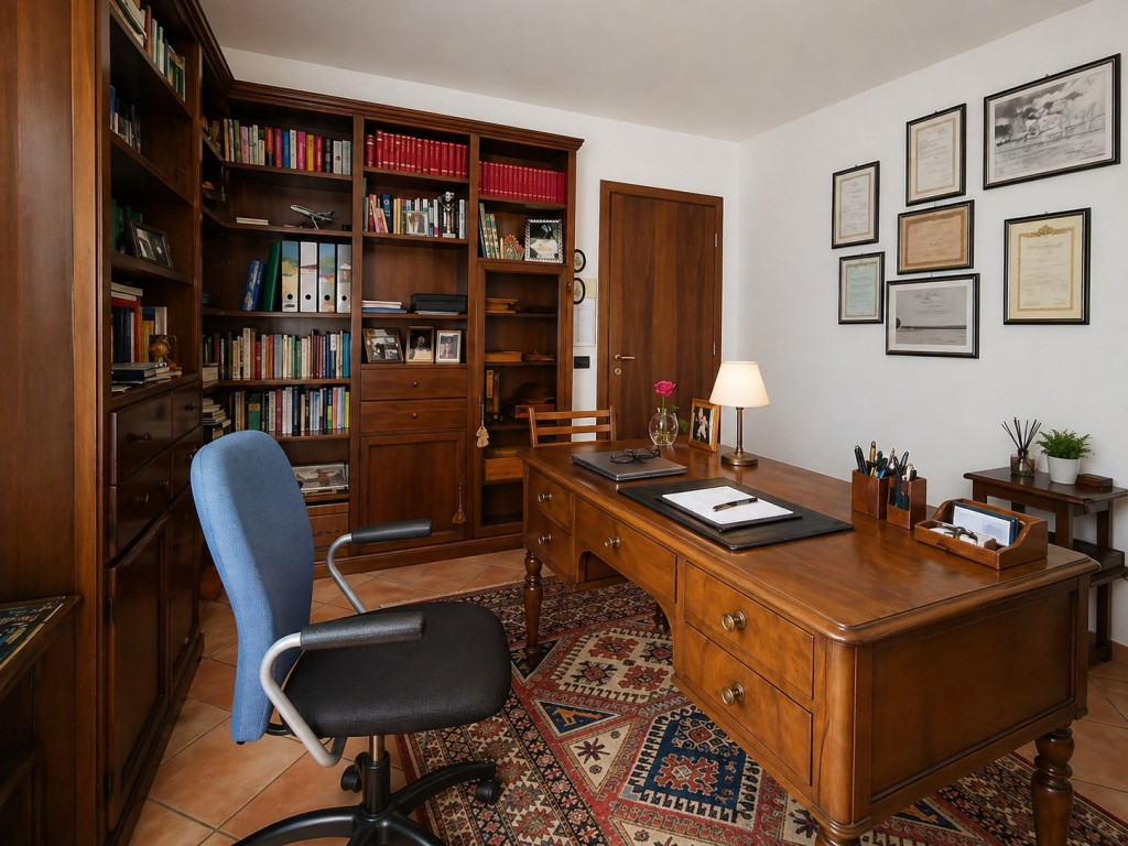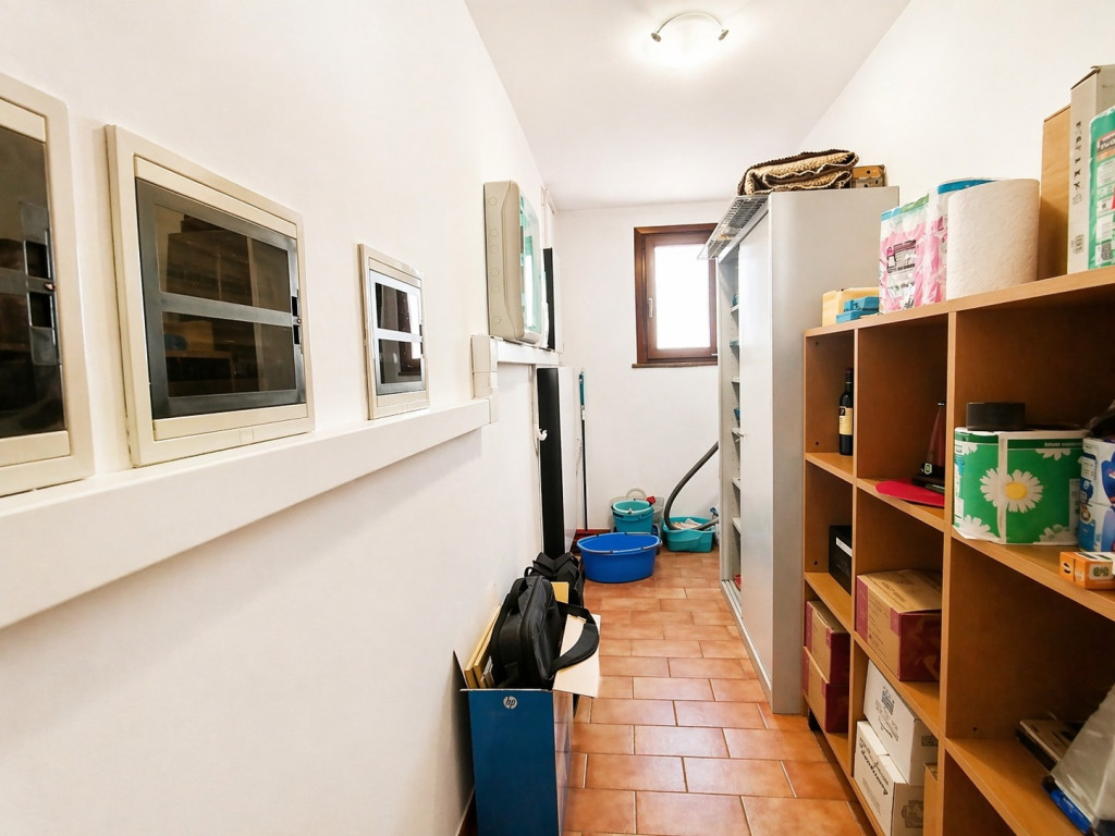 Sullo stesso livello sono presenti uno studio, una camera matrimoniale con uscita sul cortile e un bagno. Un comodo corridoio, dotato di armadiature a muro e servito da locale lavanderia, collega internamente il garage doppio, facilmente accessibile anche dall’esterno grazie a un ingresso carrabile ampio e funzionale.