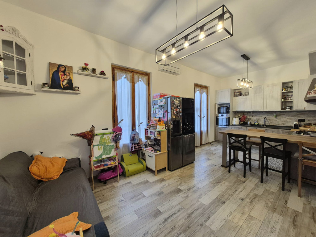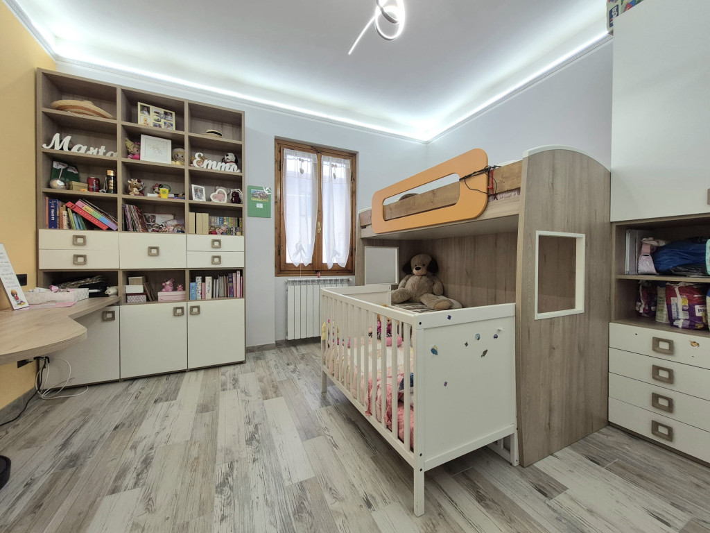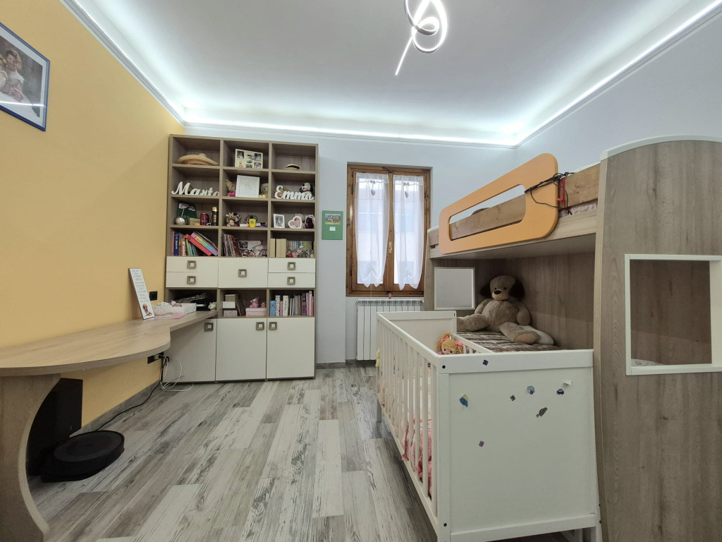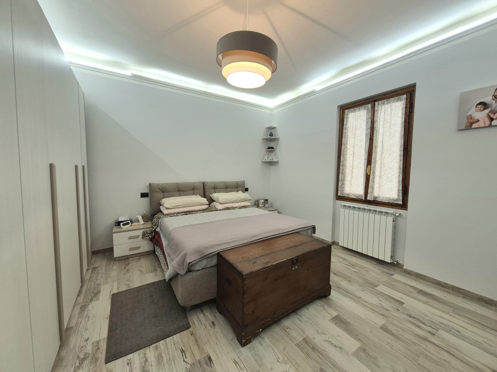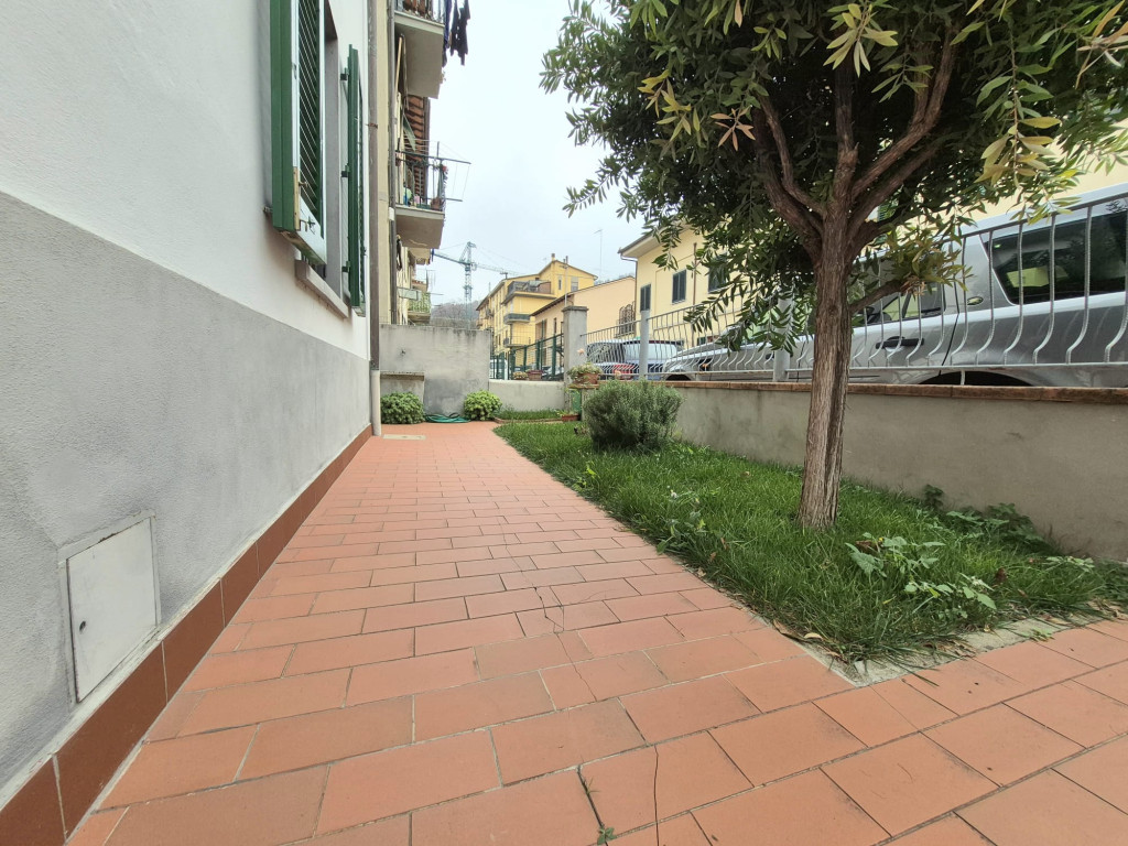 In zona residenziale vicino a tutti i servizi troviamo questo comodissimo appartamento posto al primo piano di villino bifamiliare. L'appartamento frutto di una recentissima ristrutturazione risulta essere pertanto in ottime condizioni. Al pian terreno, con ingresso indipendente, attraversando il giardinetto di proprietà si entra nell'androne scale esclusivo che conduce al primo e di ultimo piano. Ci accoglie un arioso ingresso che funge anche da disimpegno attraversando il quale raggiungiamo la zona cucina-pranzo openspace, ambiente molto confortevole in quanto ben illuminato e areato, dotato di termocamino e accesso al balcone che costeggia tutto un lato dell'appartamento. Il salotto anch'esso molto spazioso è dotato di portafinestra che conduce al balcone. Le due camere matrimoniali al piano sono entrambe molto ampie e accoglienti, il servizio principale è finestrato e dodato di doccia, mentre il secondo servizio non finestrato vista la metratura di oltre 9 mq è adatto ad essere utilizzato anche come lavanderia. Completa la proprietà la mansarda abitabile, sfruttabile sia come terza camera che come studio. La parte più bassa del sottotetto è stata sapientemente sfruttata come zona ripostiglio.