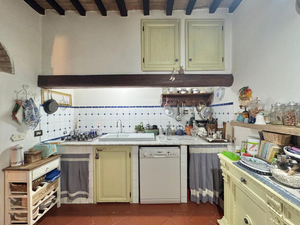 LA COLONICA, disposta su due livelli, conserva tutto il fascino dello stile rustico toscano, con ambienti caldi e accoglienti. Al piano terra si sviluppano diverse zone giorno, tra cui un ampio soggiorno impreziosito da un camino con stufa, oltre a due cucine abitabili dal carattere tradizionale. Sempre sullo stesso livello troviamo una camera con servizio, oltre a spazi accessori come ripostiglio, cantina e lavanderia. Salendo al piano superiore tramite una caratteristica scala in pietra serena, si accede alla zona notte composta da tre spaziose camere matrimoniali, un ripostiglio e un bagno finestrato.