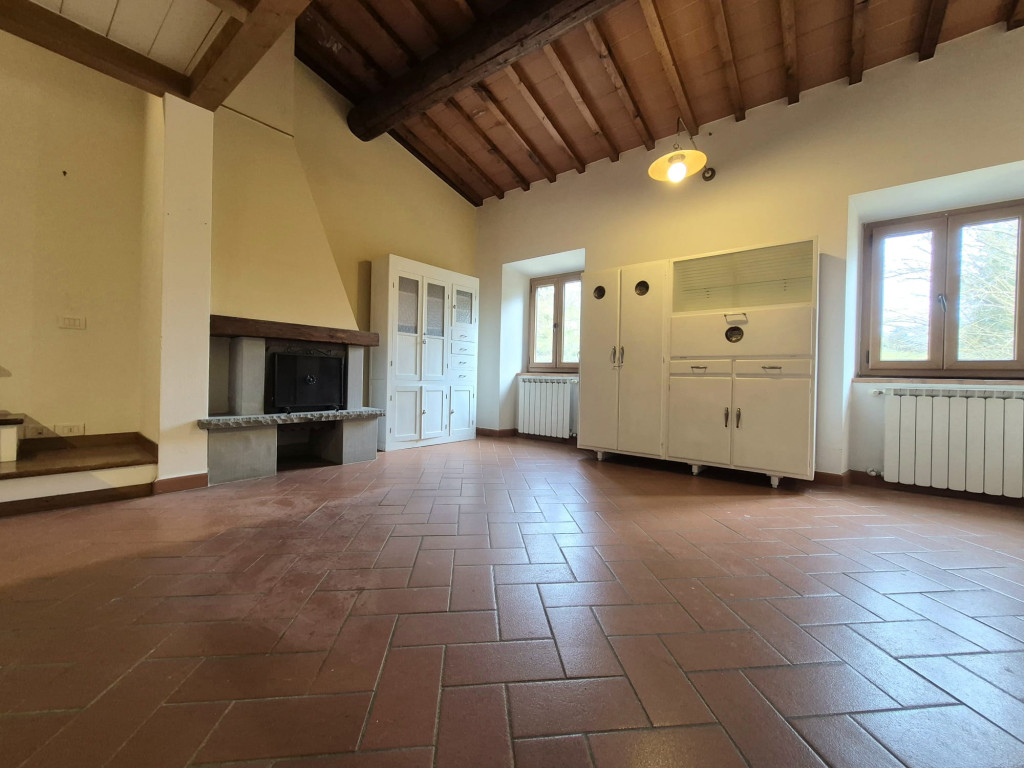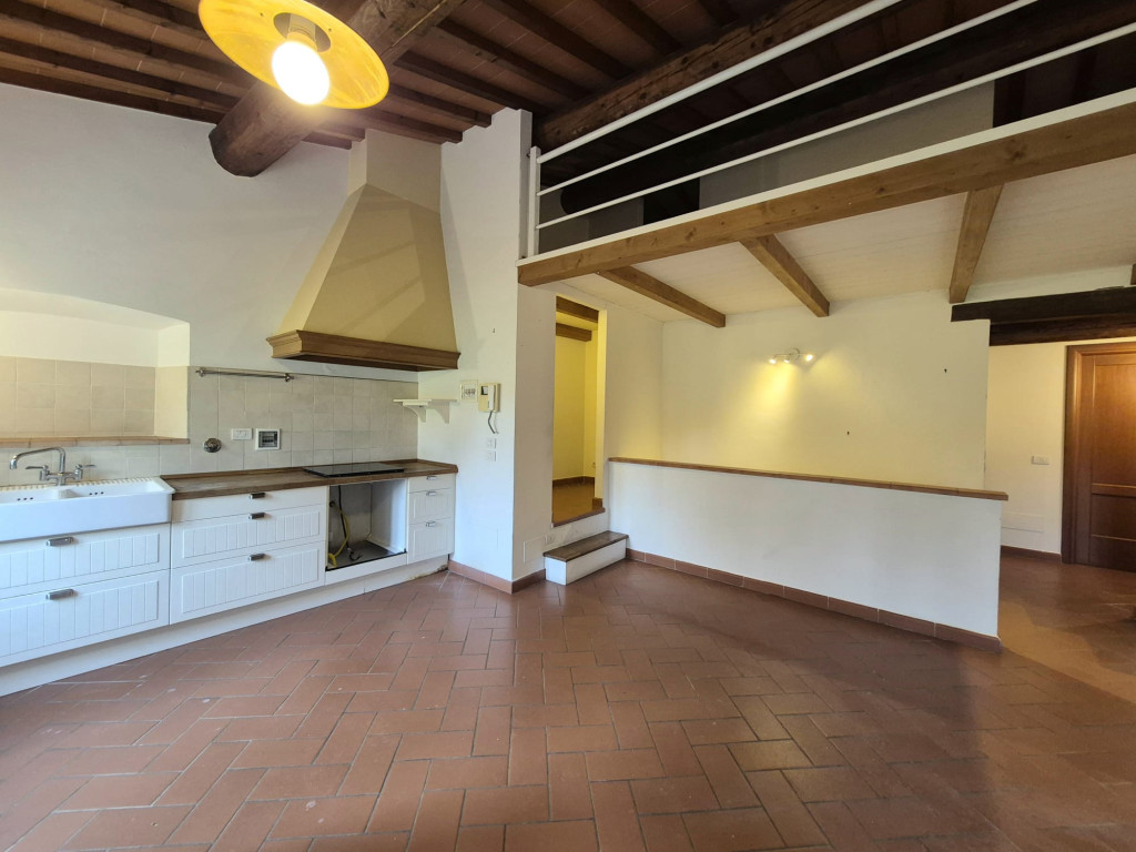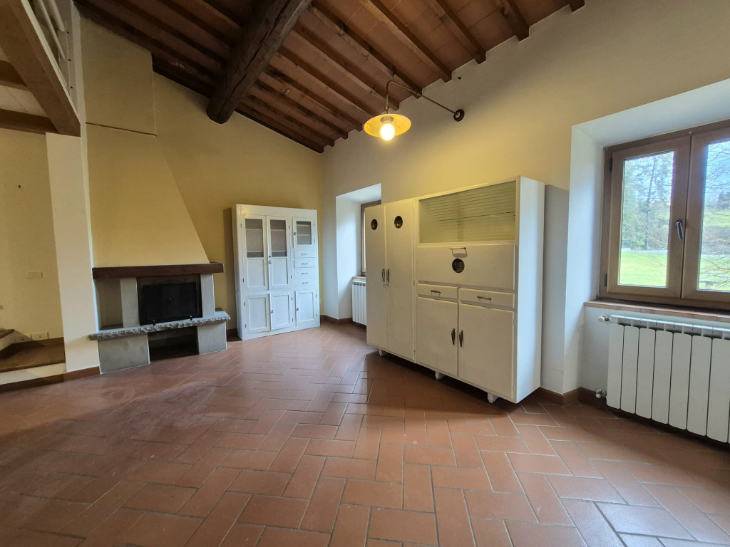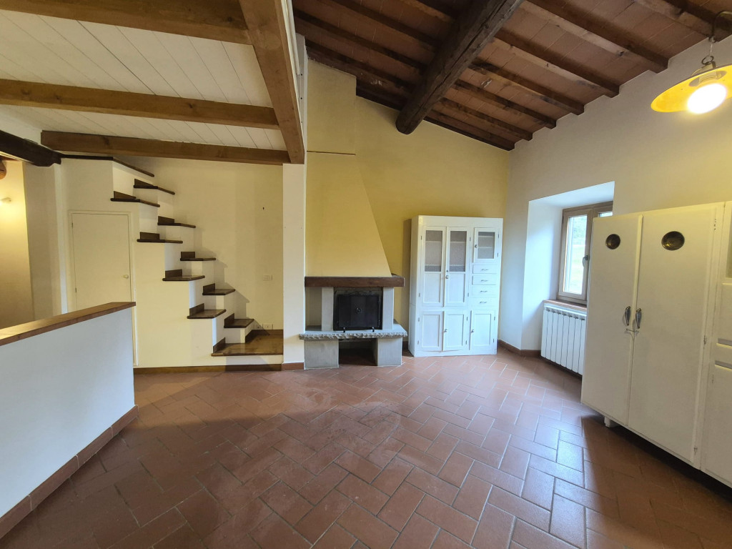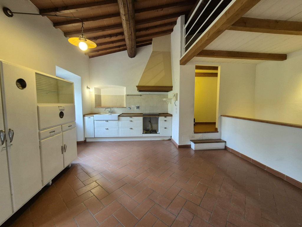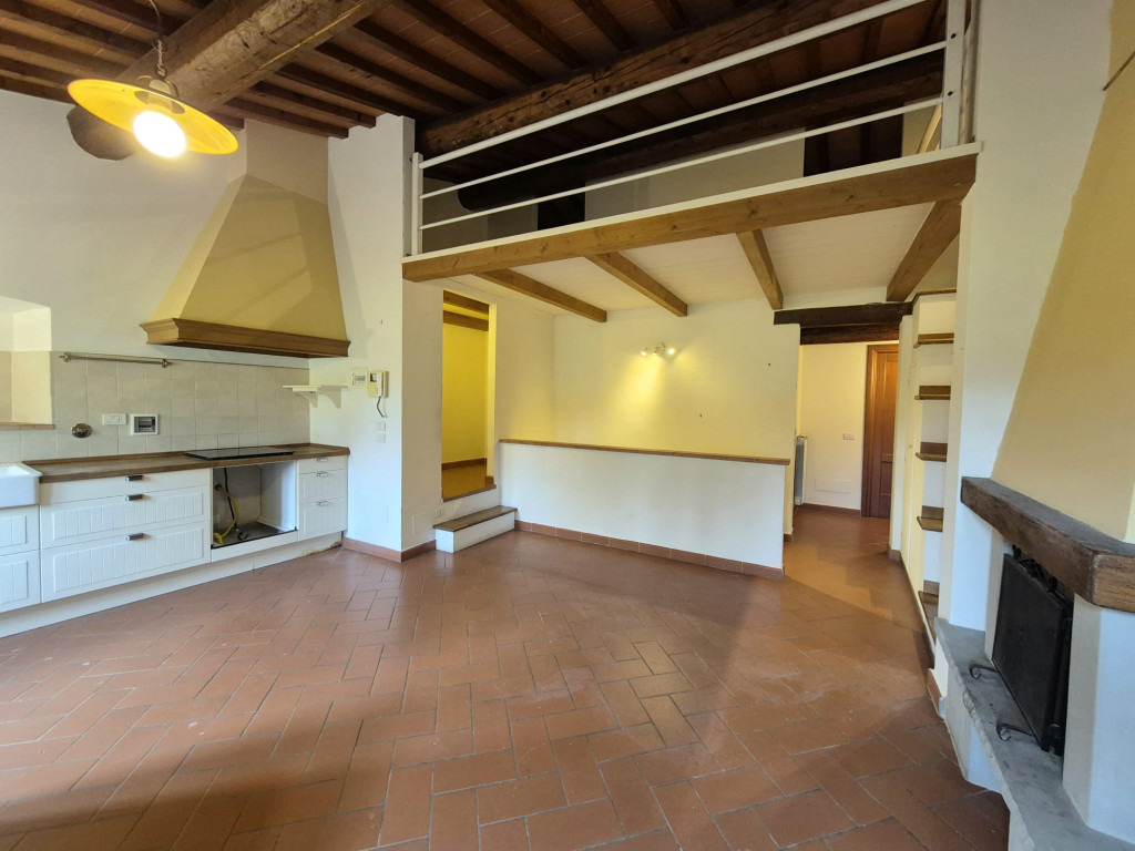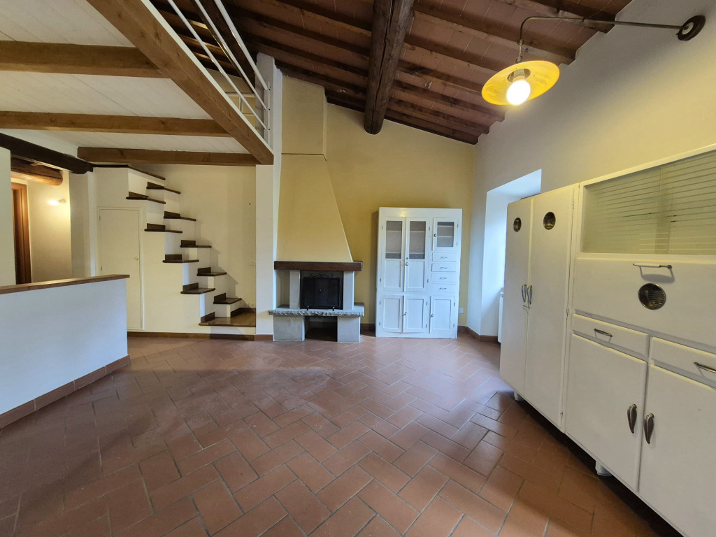 In contesto residenziale immerso nel verde troviamo questo delizioso appartamento posto al primo ed ultimo piano. L'accesso all'unità immobiliare avviene da un'ampia resede comune lastricata e tramite scala di proprietà si raggiunge il primo piano. L'appartamento è caratterizzato da una zona living openspace con cucina a vista e impreziosita da un funzionale caminetto e un ampio ripostiglio dispensa, dal disimpegno si giunge ad una camera matrimoniale ariosa e con affacci nel verde, al servizio dotato di vasca e alla seconda stanza in soppalco a sbalzo sulla zona giorno.