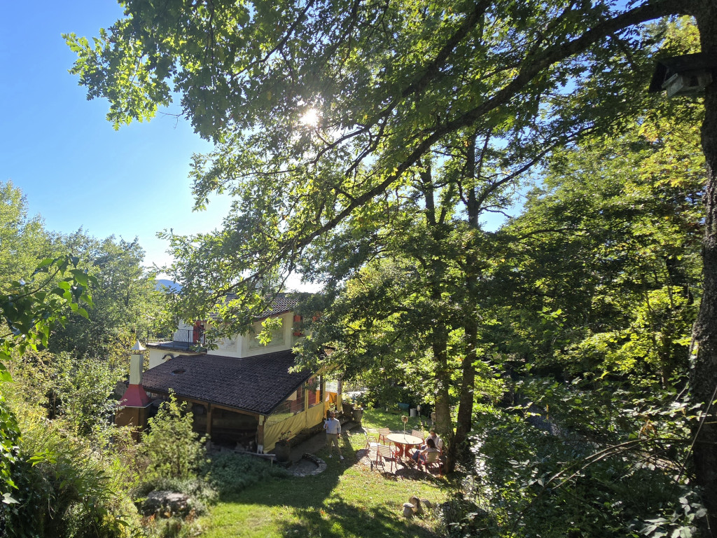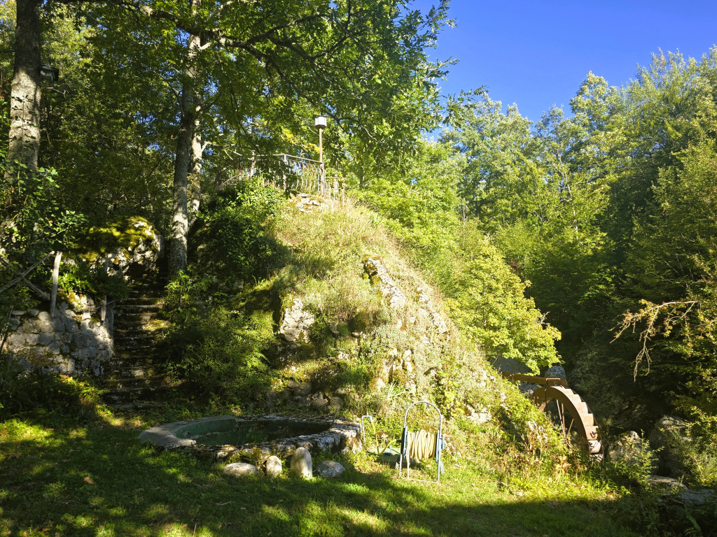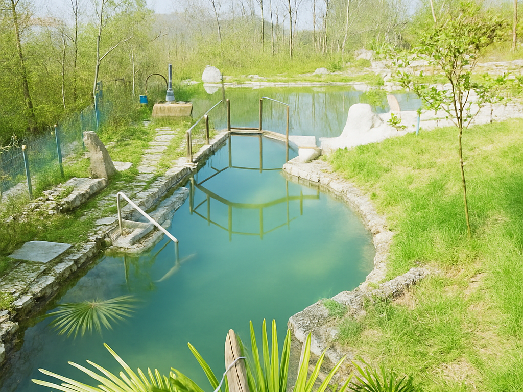 Ma è il parco a raccontare la vera magia. Un mulino ad acqua, ancora funzionante, trasforma il movimento del torrente in energia, come se la natura stessa volesse prendersi cura della casa. Poco distante, una biopiscina si apre come uno specchio tra gli alberi, servita da spogliatoi, bagni, giochi e angoli di quiete. Qui, il tempo non corre: si distende, si adagia, si lascia vivere.
