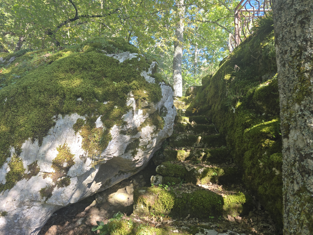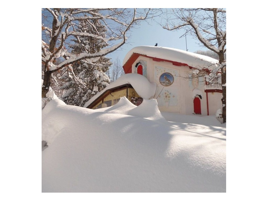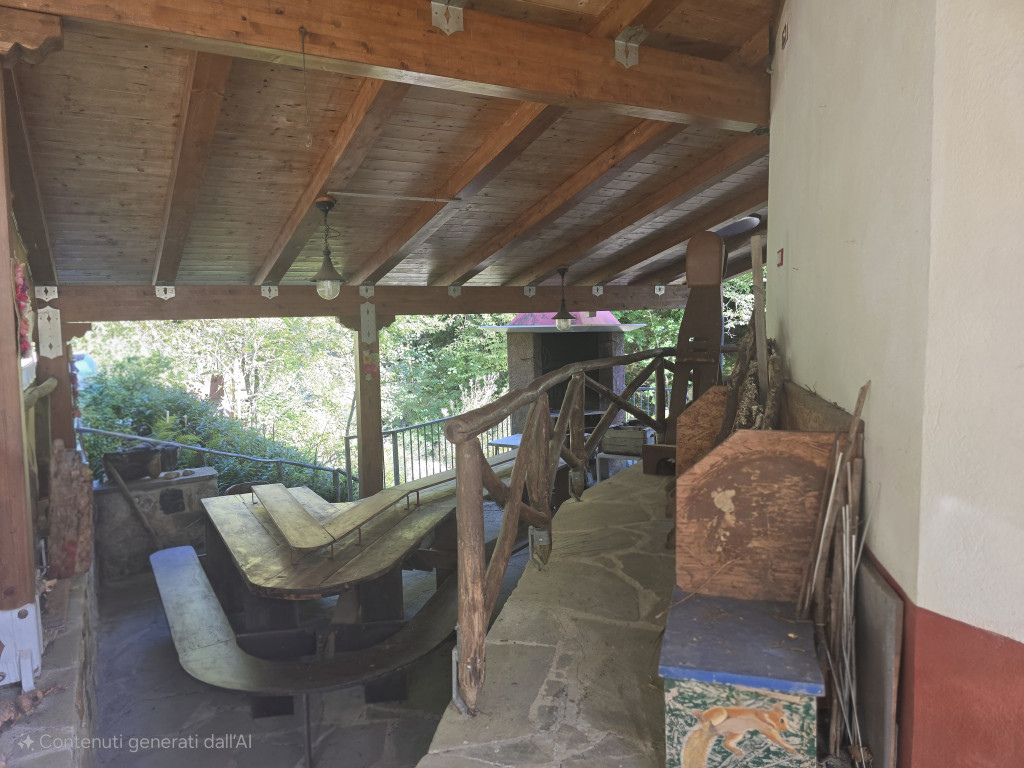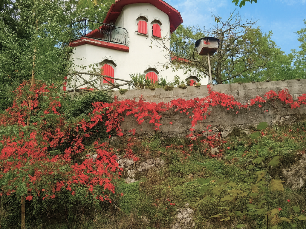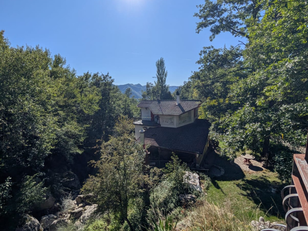 Appena si varca il cancello, il torrente Arpina accompagna ogni passo con il suo mormorio costante. Il parco si apre come un anfiteatro naturale: alberi maturi, radure soleggiate, sentieri che si perdono tra il verde. Al centro, la casa si erge con la sua architettura fuori dal tempo, fatta di linee irregolari e materiali autentici, come se fosse stata scolpita dalla montagna stessa.