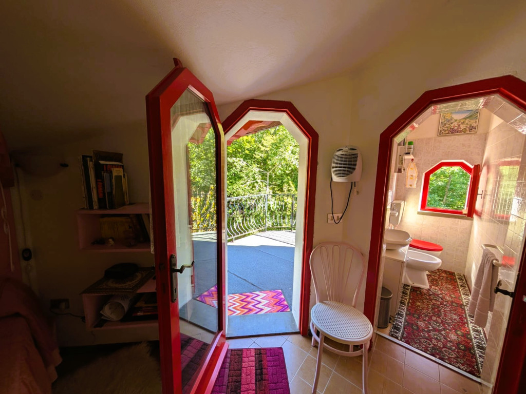 Al piano superiore, le camere si affacciano su terrazzi ampi, sospesi tra cielo e bosco. Da lì, lo sguardo abbraccia il parco, segue il corso dell’acqua, si perde tra le cime lontane. I bagni, luminosi e finestrati, conservano il fascino di un tempo in cui ogni dettaglio era pensato per durare.